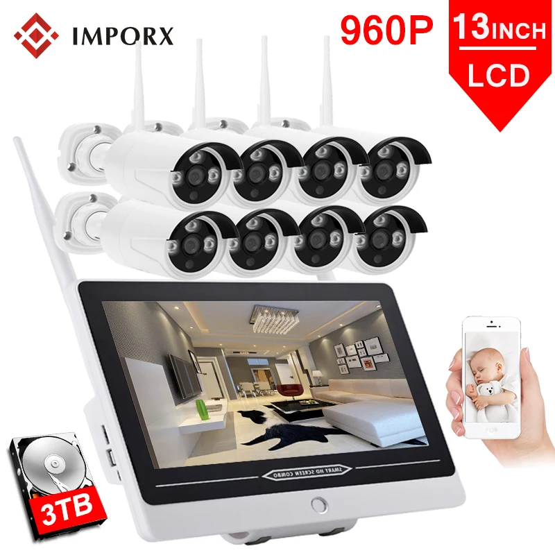 960P 8CH Wireless NVR Kits CCTV System 13" LCD Monitor Screen 1.3MP 8PCS Wifi IP Camera Outdoor P2P