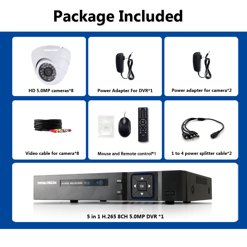 NINIVISION H.265 8CH 5MP 1080P AHD NVR Audio CCTV Security System 5MP Dome HD Camera IR-CUT P2P Ind