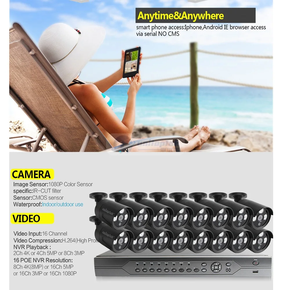 UNITOPTEK 16CH 1080P POE NVR System Kit With 16Pcs 2.0MP Bullet Network IP Camera Outdoor Waterproo