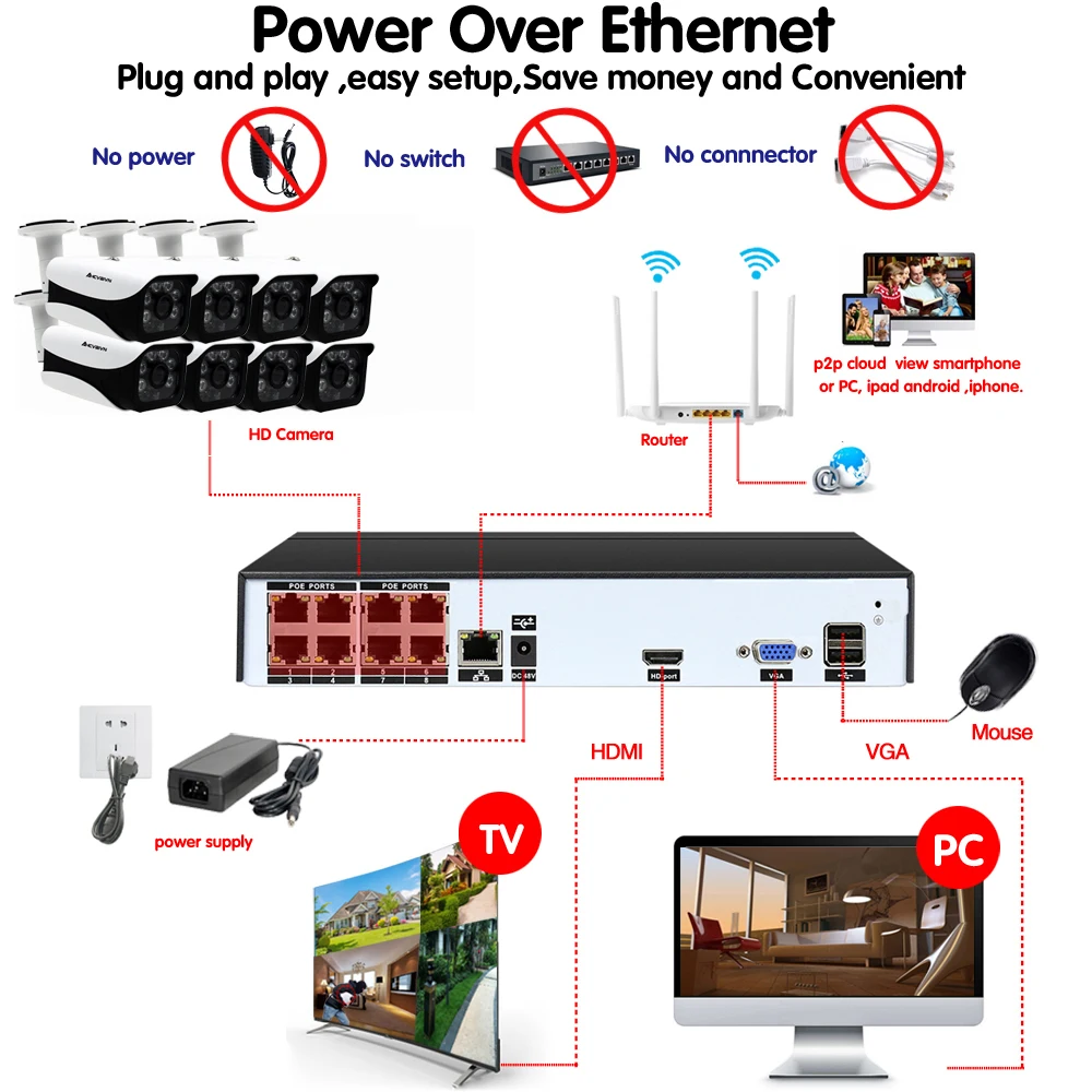 AHCVBIVN 8CH 5MP POE NVR Night Vision CCTV System Plug and Play Video Surveillance Kit Outdoor Wate