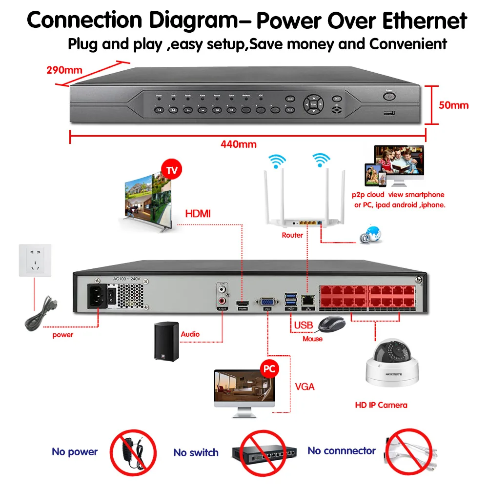 HKIXDISTE 4K 16CH H.265 CCTV POE NVR 48V 16Channel*5MP/ 8 Channel*4K Surveillance CCTV Network Vide
