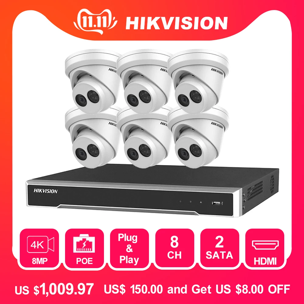 Hikvision 8CH CCTV Camera System 48V POE NVR Kit Onvif HD 8MP HD POE IP Camera Waterproof Night Vis